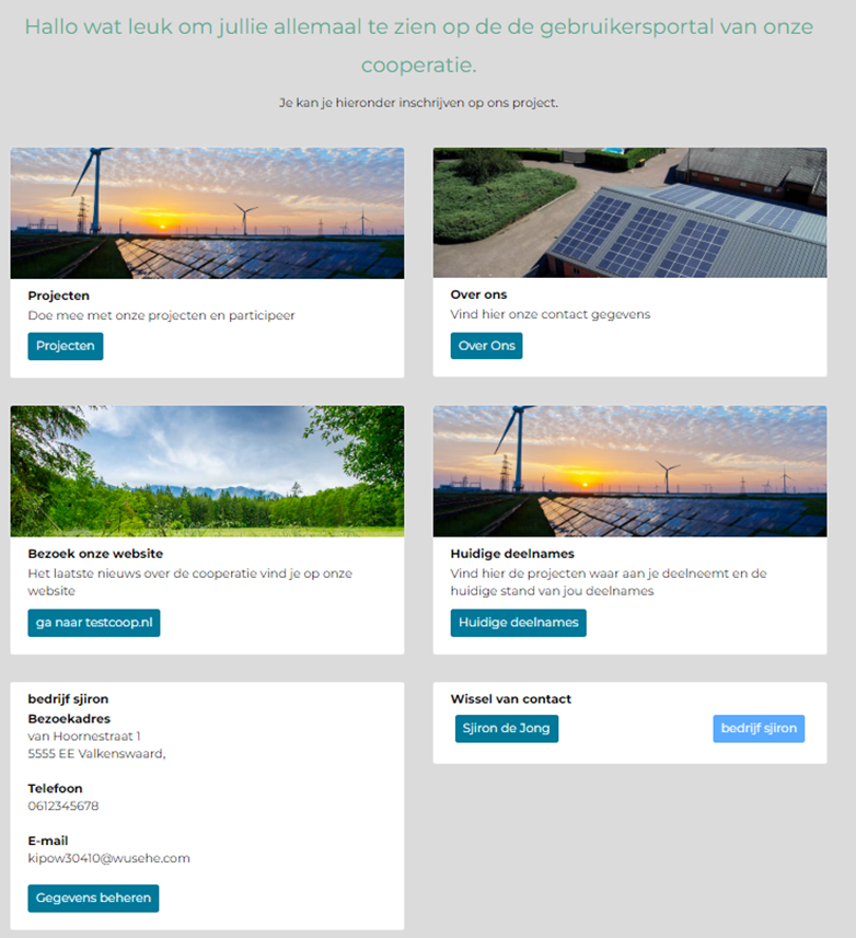 Op de contactenportaal kunnen de contacten van jouw coöperatie na inloggen zelf hun gegevens zien en wijzigen. Ze kunnen zien in welke projecten ze deelnemen en inschrijven op nieuwe projecten.
